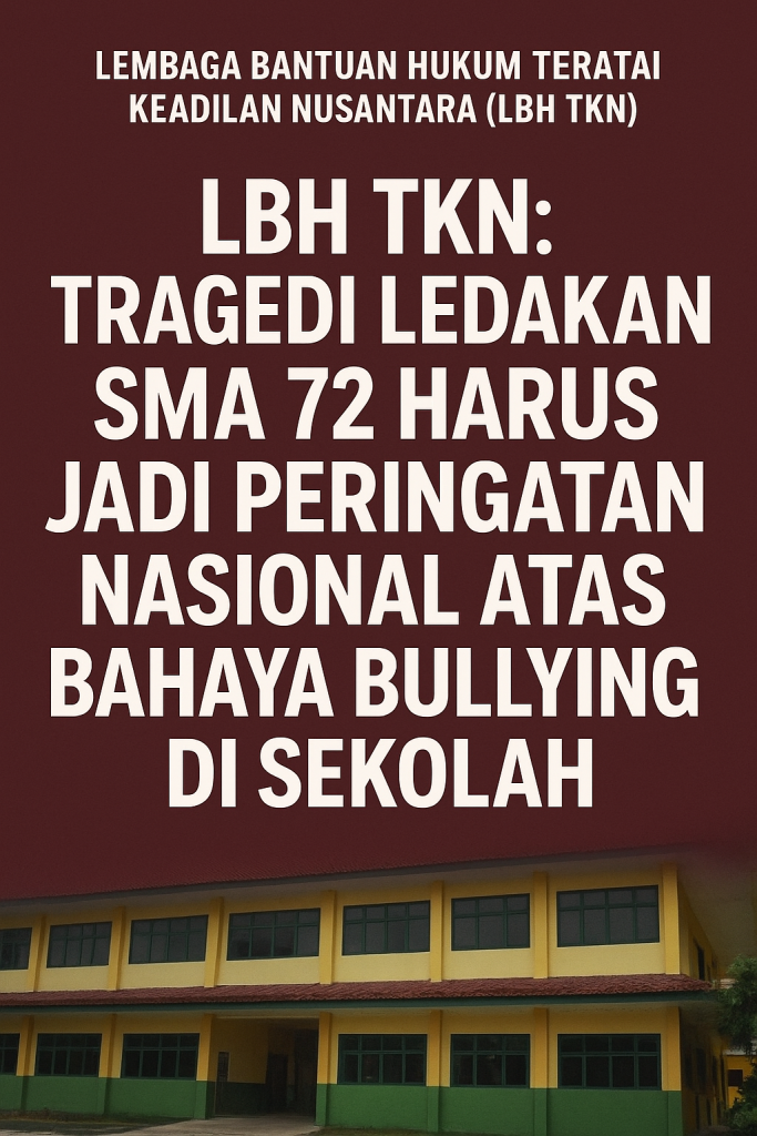 Cikarang, 08 November 2025, Lembaga Bantuan Hukum Teratai Keadilan Nusantara (LBH TKN) menyampaikan keprihatinan mendalam atas peristiwa ledakan yang terjadi di SMA Negeri 72 Jakarta, Kelapa Gading Barat, Jakarta Utara, pada Jumat, 7 November 2025, yang menyebabkan sedikitnya 54 siswa mengalami luka-luka, baik luka bakar, serpihan benda tajam, maupun trauma psikologis.